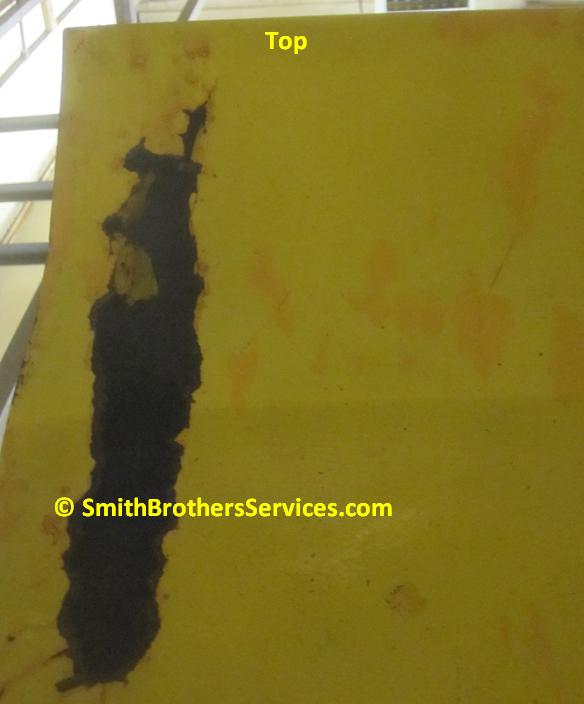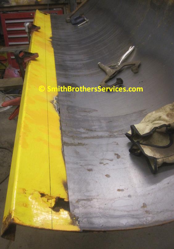 Marking cut line where new skin will meet old at top of Moldboard. Unlike the Meyer ST Series, the Meyer C Series does not have a piece of angle iron across the top, it is formed as part of the skin. It is easier to splice the new skin in rather than remove this portion. Most of the time the top 3" or so of the old skin is fine (solid), so this is not a problem.